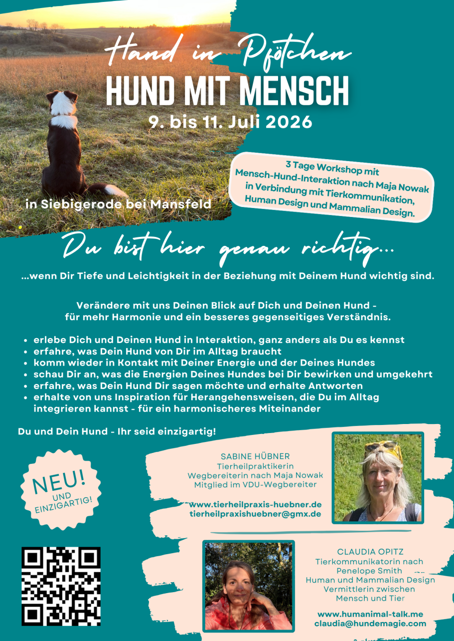 Die Werkzeuge Human Design und Mammalian Design (das Human Design für Säugetiere) unterstützen mein Wirken. Damit tauchen wir ganz tief ein in Eure energetischen Signaturen und gehen dabei dem einzigartigen Band auf den Grund, welches Euch Beide verbindet. Wir finden darin die nächsten Puzzleteile, die unser Bild immer vollständiger machen.